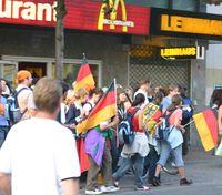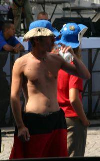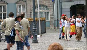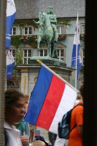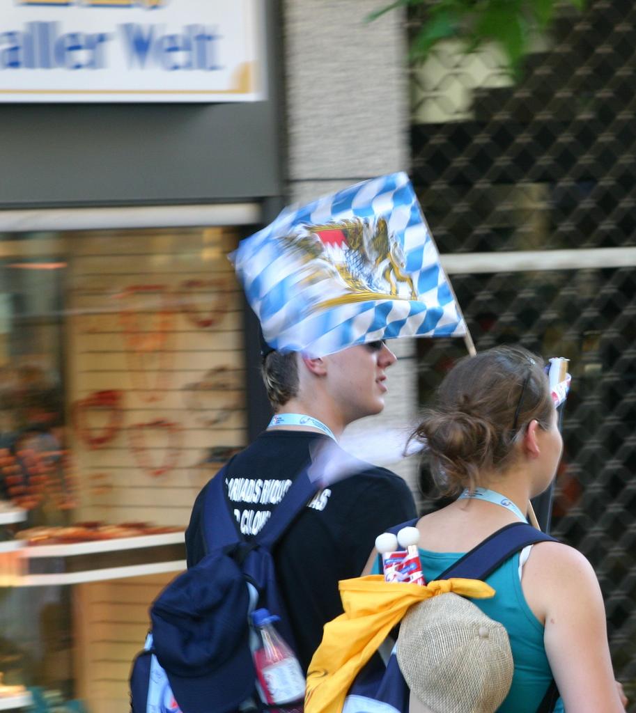 ich gebs ja zu, im ersten moment dachte ich: "jetzt isses also passiert. die russen stehen am jan wellem. und eingebrockt hats uns natürlich der blöde bayer." aber dann fiel mir auf, dass die russische flagge irgendwie anders rum ging. als mir der schreck aus den gliedern wich, waren die jungs schon weg. für einen sachdienlichen hinweis wär ich trotzdem dankbar. denn diese woche sind wir in ermangelung einer ausweichgelegenheit ja alle weltjugend-dingsis. so wie die, die auf dem burgplatz zur uneuphorisiert völlig unverträglichen sex bomb darbietung einer viertklassiken lokalen coverband eine fahnenpolonaise inszenieren, oder wie die, bei denen die explosive mischung aus englischkenntnissen und authoritätsglauben dann doch zu einem gewissen inkompatibilitätsgefühl führen. aber schon die herren kardinäle mussten ja einsehen, das man nicht immer im griff hat, wer so alles kommt, wenn man ruft. da müssen die jetzt durch. uns hat ja schliesslich auch keiner gefragt. dabei haben wir noch nicht mal gerufen.